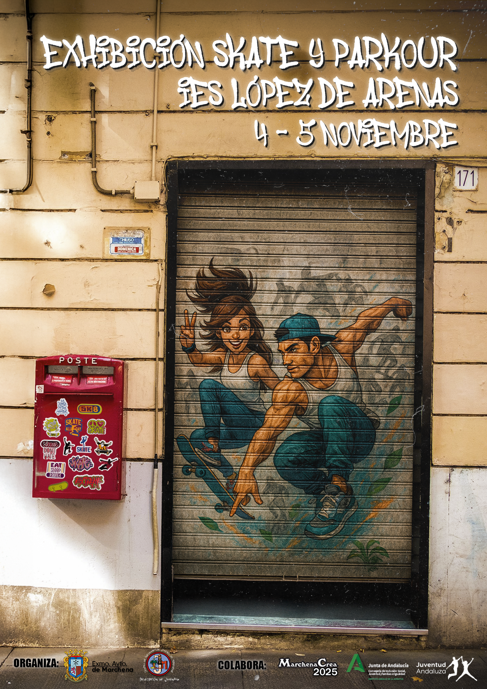 Los próximos 4 y 5 de noviembre en el IES López de Arenas desarrollaremos una actividad formativa y de exhibición de Skate y Parkour organizada por la Delegación de Juventud del Ayuntamiento de Marchena dentro del proyecto Marchena Crea 2025, en el que colabora el Instituto Andaluz de la Juventud.