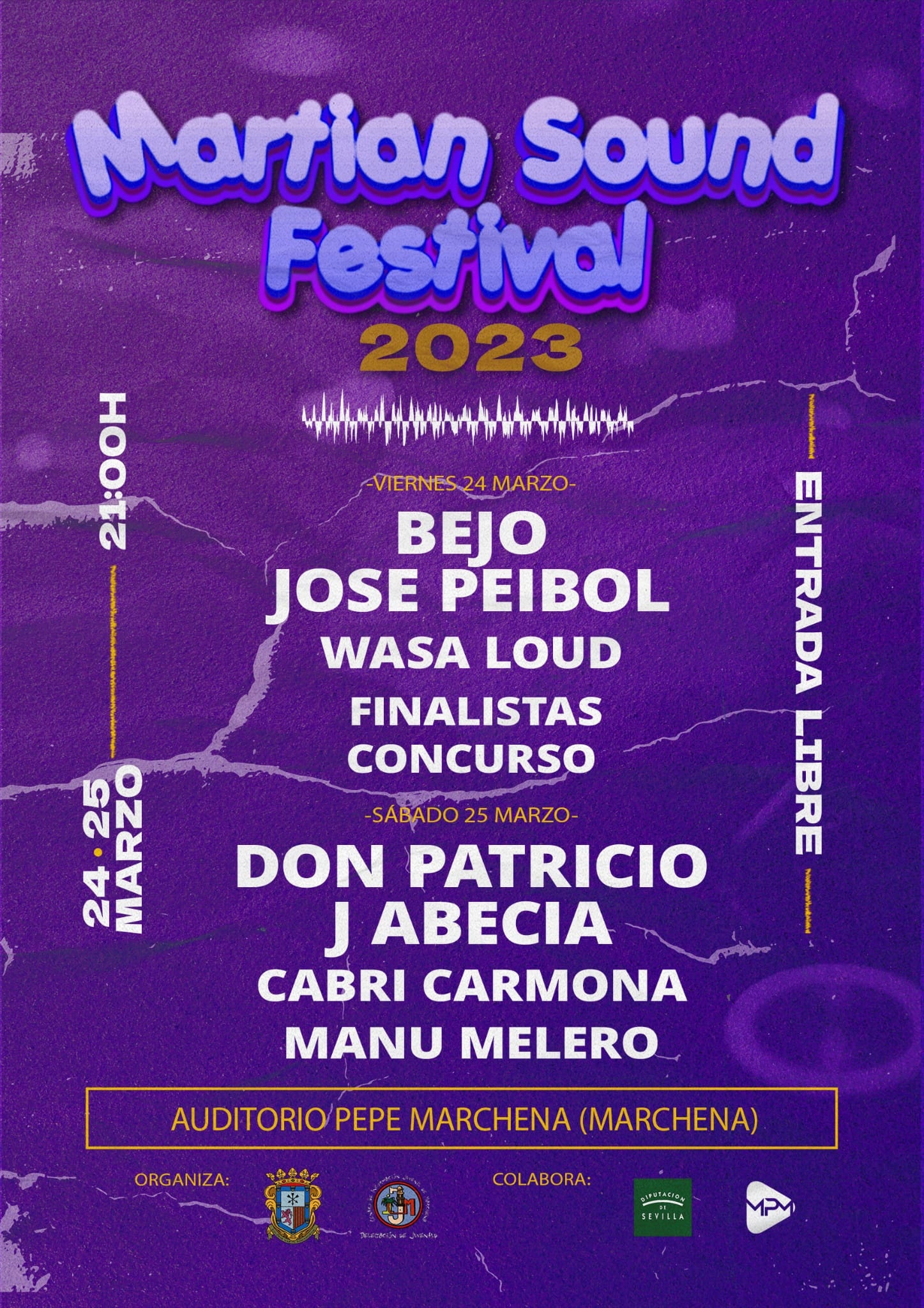 Desde la Delegación de Juventud del Ayuntamiento de Marchena os traemos el evento musical que estabais esperando...., vuelve 𝐌𝐀𝐑𝐓𝐈𝐀𝐍 𝐒𝐎𝐔𝐍𝐃 𝟐𝟎𝟐3. En el festival de dos días actuarán el viernes 24 de marzo: Bejo + Jose Peibol + Wasaloud + Bandas finalistas del concurso Martian Sound. El sábado 25 de marzo actuarán: Don Patricio + J Abecia + Cabri Carmona + Manu Melero. El festival se desarrollará en el Auditorio Pepe Marchena con entrada gratuita. El comienzo de las actuaciones será a partir de las 21:00 horas. Os esperamos a todos y todas.