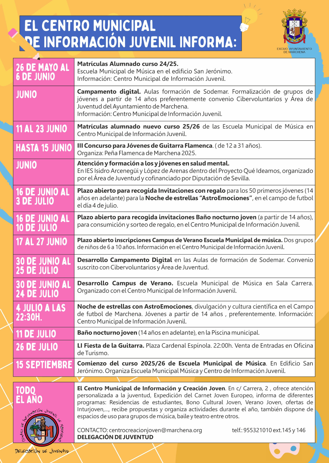 Desde el Centro de Información Juvenil de Marchena os facilitamos el panel informativo de mayo a septiembre de 2025 con todas las actividades que podréis disfrutrar entre esas fechas.